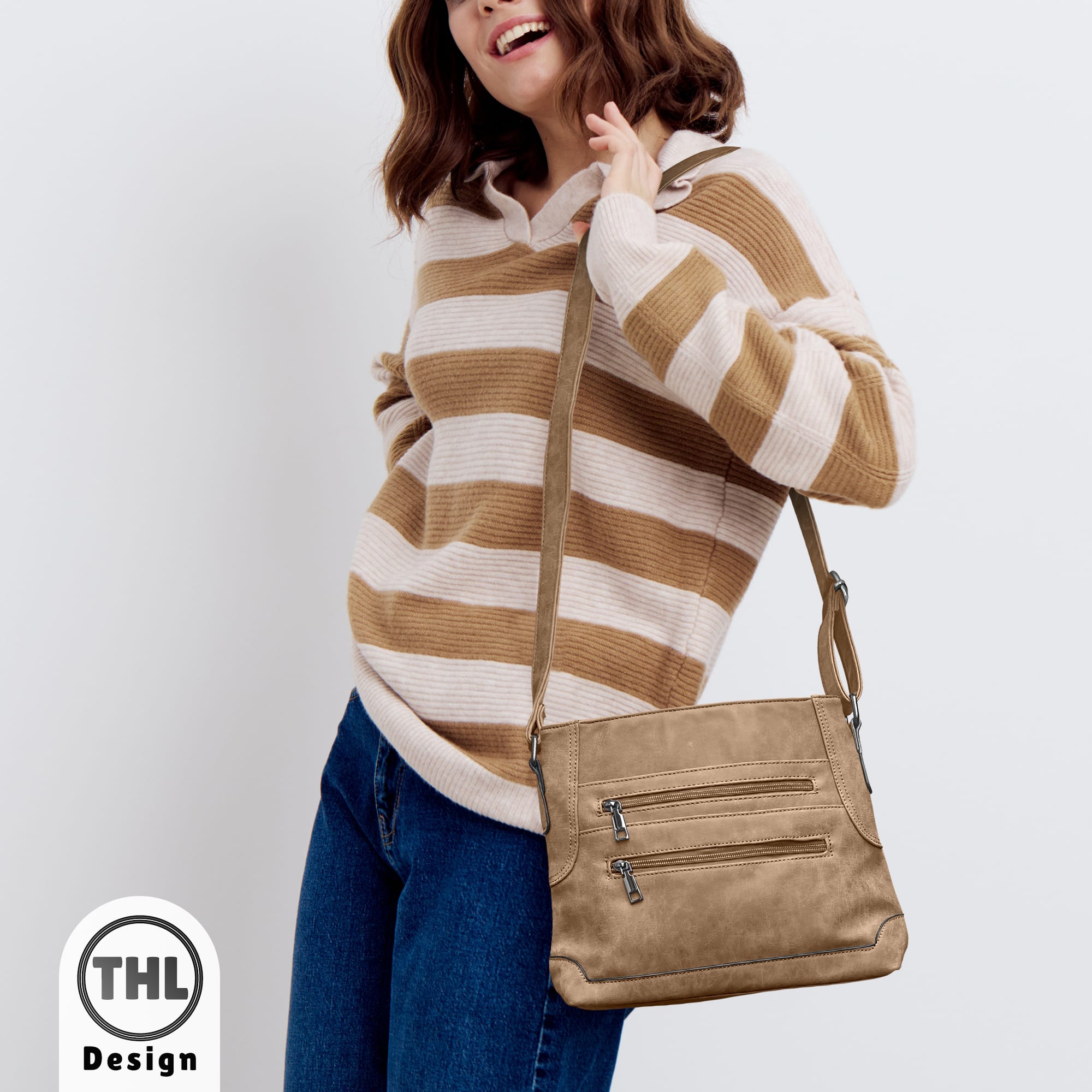 Een handige plat model schoudertas met een goede verstelbare schouderband. De bruine THL crossbodytas heeft allerlei handig ritsvakken waar je overzichtelijk je spullen in op kunt bergen. Ben jij op zoek naar een tussenmaat schoudertas? Dan is deze tas ideaal voor jou. Je kan de lichtgewicht schoudertas overal mee naar toe nemen ideaal voor een dagje weg, op reis of bijvoorbeeld als je gaat fietsen.