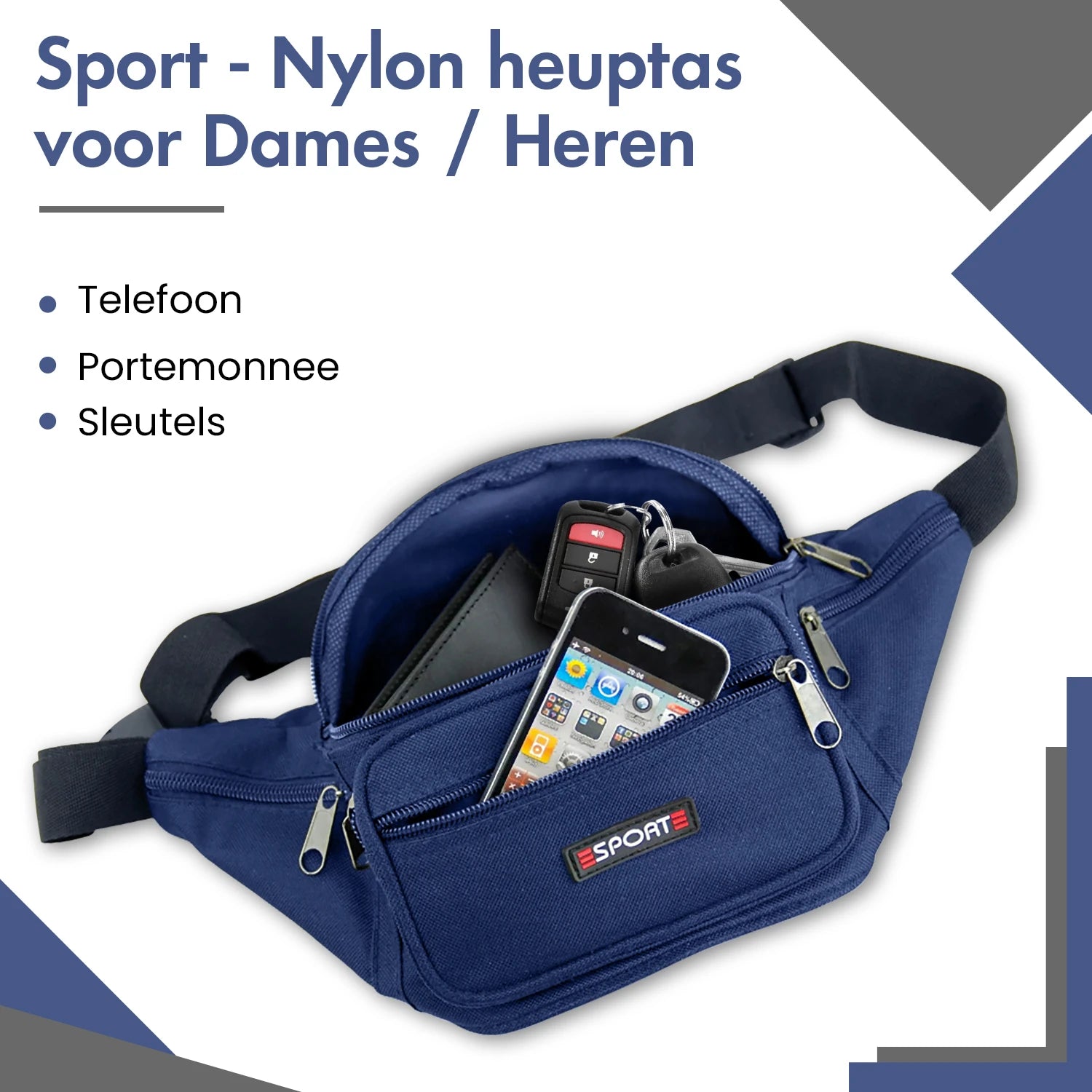 Heb jij geen zin in een zware grote tas? Dan is dit heuptasje ideaal voor jou! Met deze heuptas heb je lekker je handen vrij en zit de tas niet in de weg. Al je kleine belangrijke bezittingen veilig opgeborgen zakkenrollers maken geen kans meer. Je draagt de heuptas voor je of schuin als crossbody verschillende mogelijkheden dus. Deze heuptas is gemaakt van sterk en licht polyester en is om je middel te bevestigen door middel van een kliksluiting. Je kan de nylon verstelbare schouderband op iedere gewenste lengte dragen. De tas heeft een royaal hoofdvak met ritssluiting en 2 ritsvakken aan de voorkant. Aan de zijkanten en aan de achterkant zitten ook nog rits vakken.