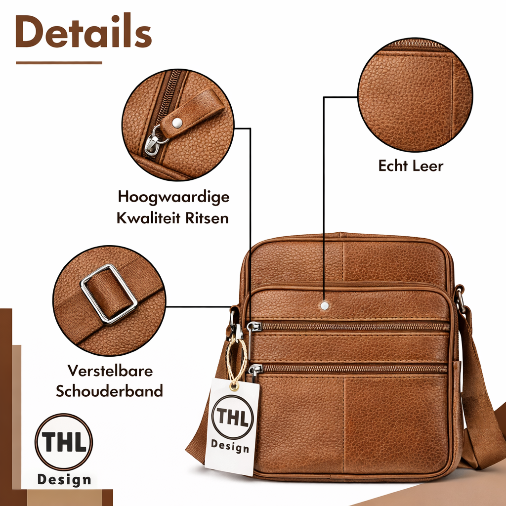 Echte leren schoudertas van het merk THL Design. De bruine tas is gemaakt van een mooie kwaliteit rundleer wat zorgt voor een lange levensduur. De kleine leren schoudertas heeft een lang verstelbare schouderband die je op iedere gewenste lengte kan dragen en wat zorgt voor een prettig draagcomfort. Bij deze tas heb je allerlei handige ritsvakken waar je al je belangrijke spullen veilig en overzichtelijk kan opbergen.