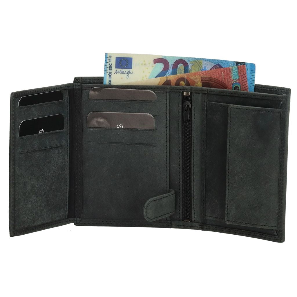 De portemonnee is eenvoudig open te vouwen, waarbij al je pasjes overzichtelijk en veilig opgeborgen zijn. Er is ruimte voor 8 pasjes en een transparant venstervak voor een ID-kaart of foto. Bovenin bevinden zich twee ruime vakken voor briefgeld, zodat je briefjes netjes kunt sorteren. Aan de binnenkant vind je ook een kleingeldvak met drukknopsluiting en een ritsvakje – ideaal voor bijvoorbeeld een sleutel of andere kleine waardevolle items.