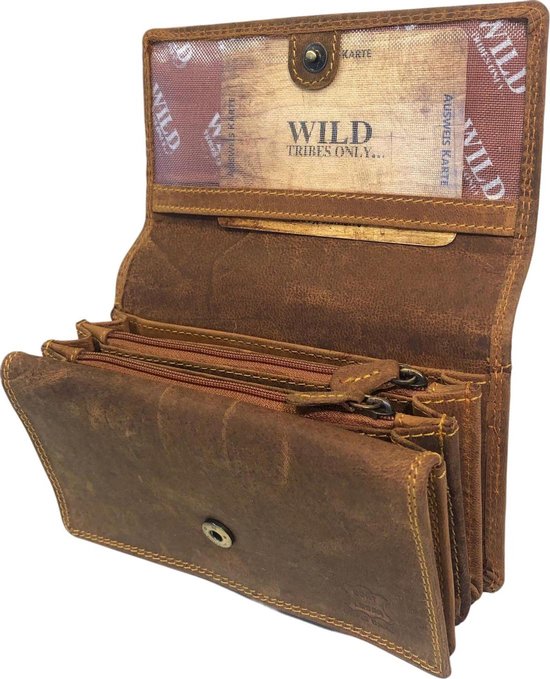 Handige huishoudportemonnee voor de dames die dagelijks hun portemonnee gebruiken tijdens het doen van de boodschappen. Het materiaal van de portemonnee is een mooie kwaliteit vintage leer wat zorgt voor een stoere uitstraling! Deze ruime overslagportemonnee heeft extra veel ruimte voor foto's en pasjes. Je heb 2 grote vensters voor foto's en een klein venster voor een ID kaart of rijbewijs. In de portemonnee is er ruimte voor maar liefst 21 pasjes. Verder heeft de harmonica model portemonnee ook nog genoeg ruimte voor briefgeld en kleingeld. In de portemonnee heb je 3 ruime vakken voor het briefgeld, 2 binnenritsjes voor bijvoorbeeld bonnetjes of een sleuteltje op te bergen. Aan de achterkant zit een ritsvak voor het kleingeld. Door het harmonica model past zelf je smartphone in deze portemonnee.
