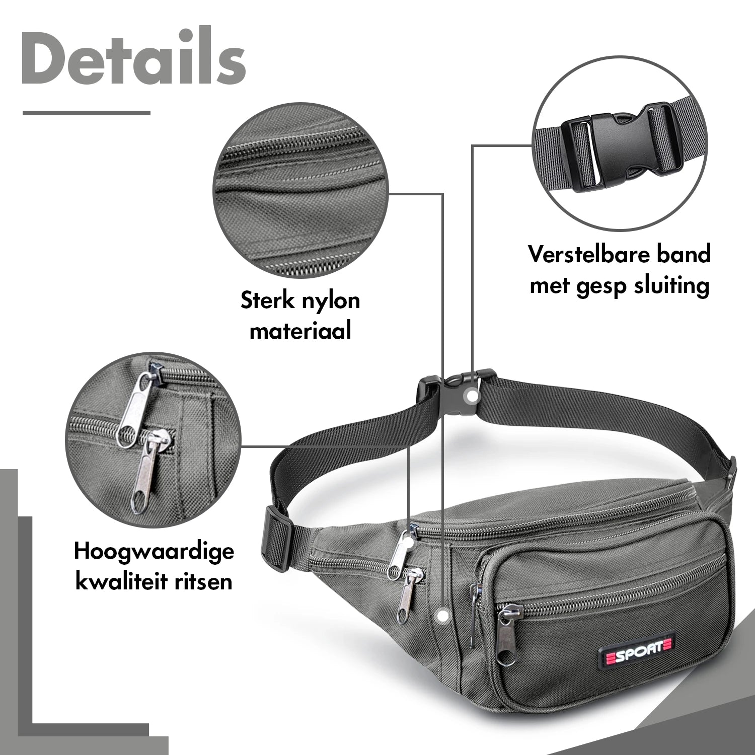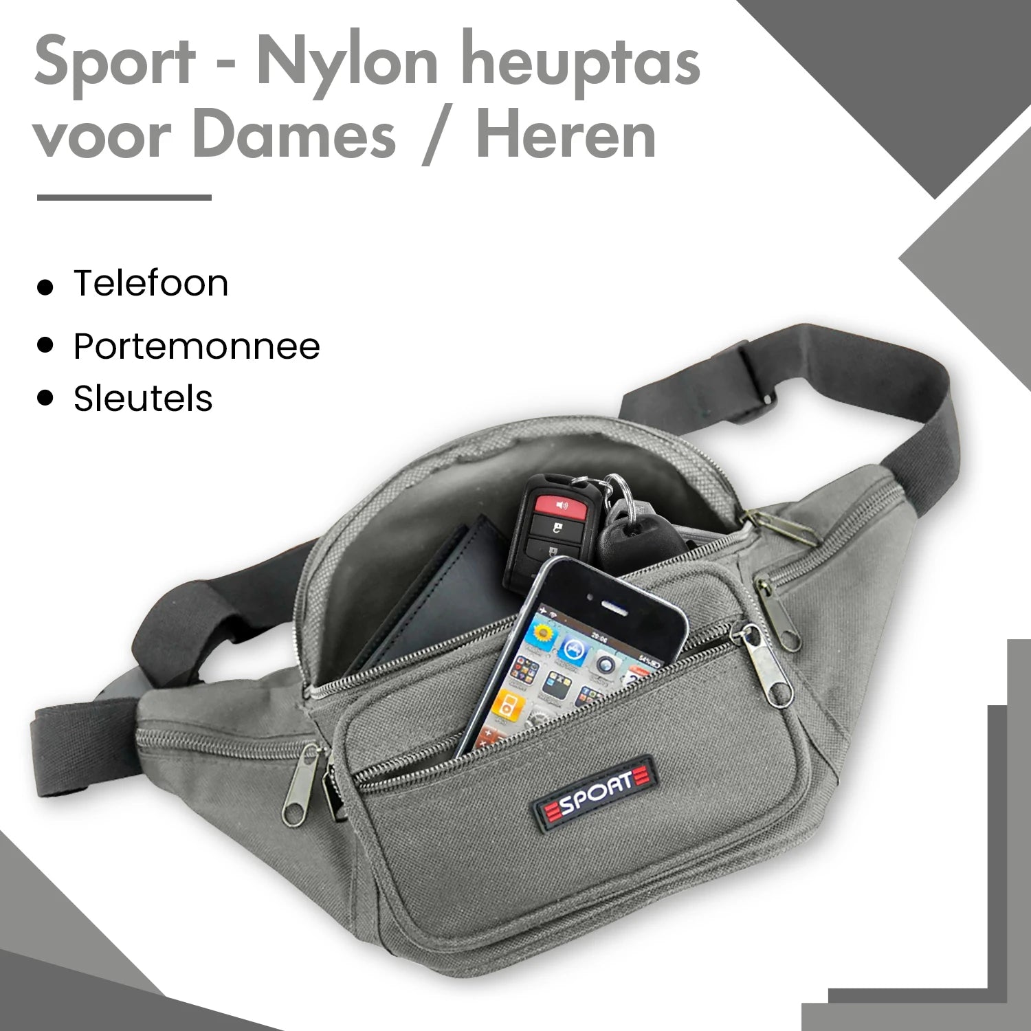 Heb jij geen zin in een zware grote tas? Dan is dit heuptasje ideaal voor jou! Met deze heuptas heb je lekker je handen vrij en zit de tas niet in de weg. Al je kleine belangrijke bezittingen veilig opgeborgen zakkenrollers maken geen kans meer. Je draagt de heuptas voor je of schuin als crossbody verschillende mogelijkheden dus. Deze heuptas is gemaakt van sterk en licht polyester en is om je middel te bevestigen door middel van een kliksluiting. Je kan de nylon verstelbare schouderband op iedere gewenste lengte dragen. De tas heeft een royaal hoofdvak met ritssluiting en 2 ritsvakken aan de voorkant. Aan de zijkanten en aan de achterkant zitten ook nog rits vakken.