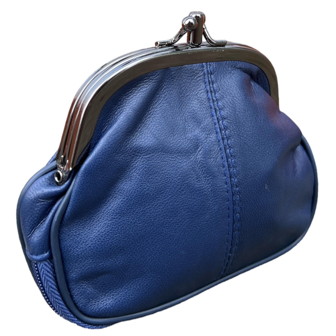 Dit donkerblauwe leren knipbeursje van THL Design is een compacte en stijlvolle damesportemonnee. Dankzij het handige formaat past deze beugelportemonnee perfect in een kleine tas of jaszak. Ideaal voor een avondje uit of wanneer een grote tas onhandig is.