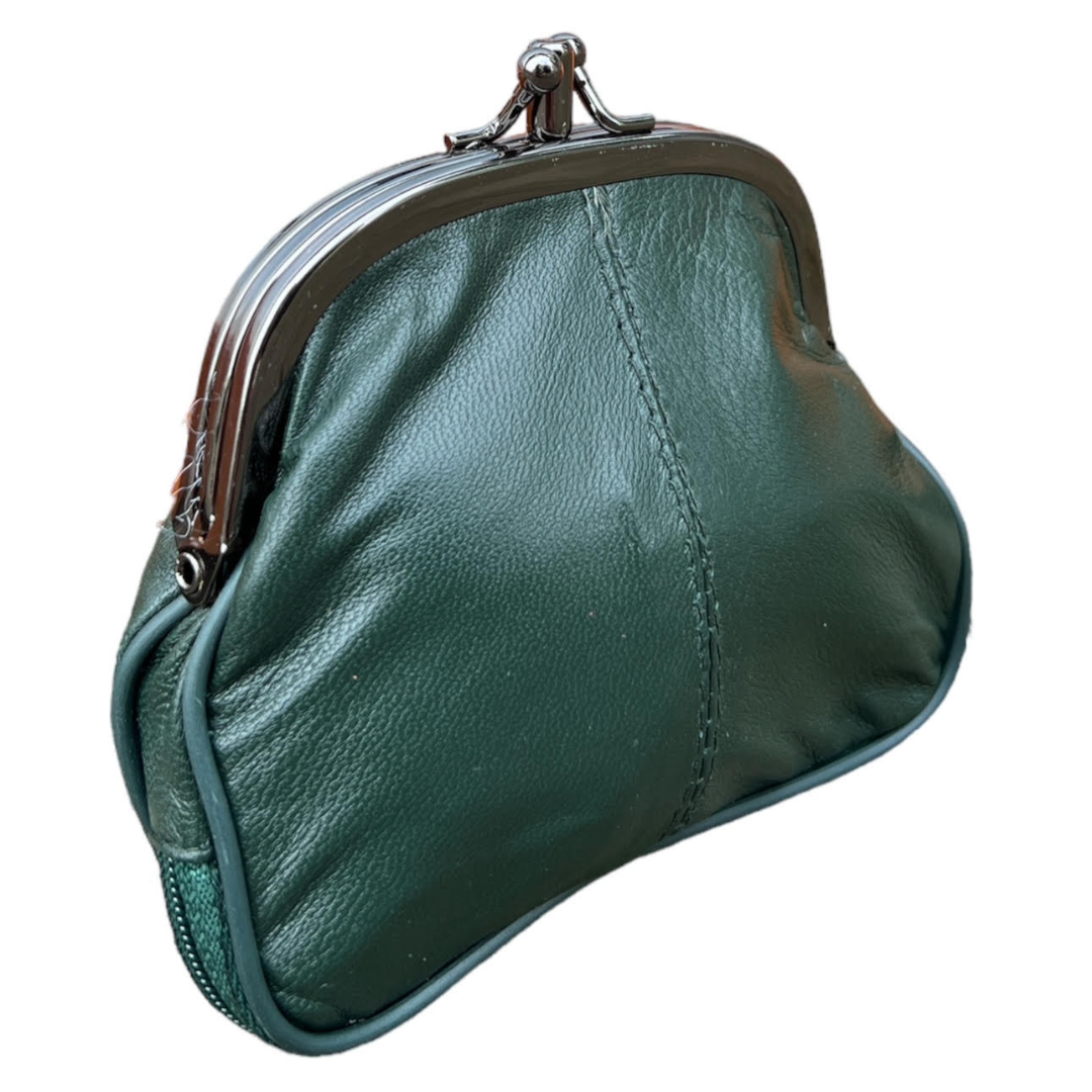 Dit donkegroene leren knipbeursje van THL Design is een compacte en stijlvolle damesportemonnee. Dankzij het handige formaat past deze beugelportemonnee perfect in een kleine tas of jaszak. Ideaal voor een avondje uit of wanneer een grote tas onhandig is.