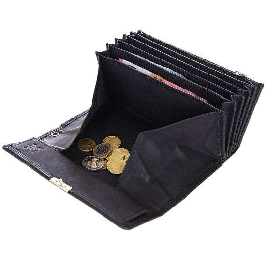 De portemonnee heeft een metalen sluiting op 3 standen waardoor de portemonnee niet zomaar kan openvallen.