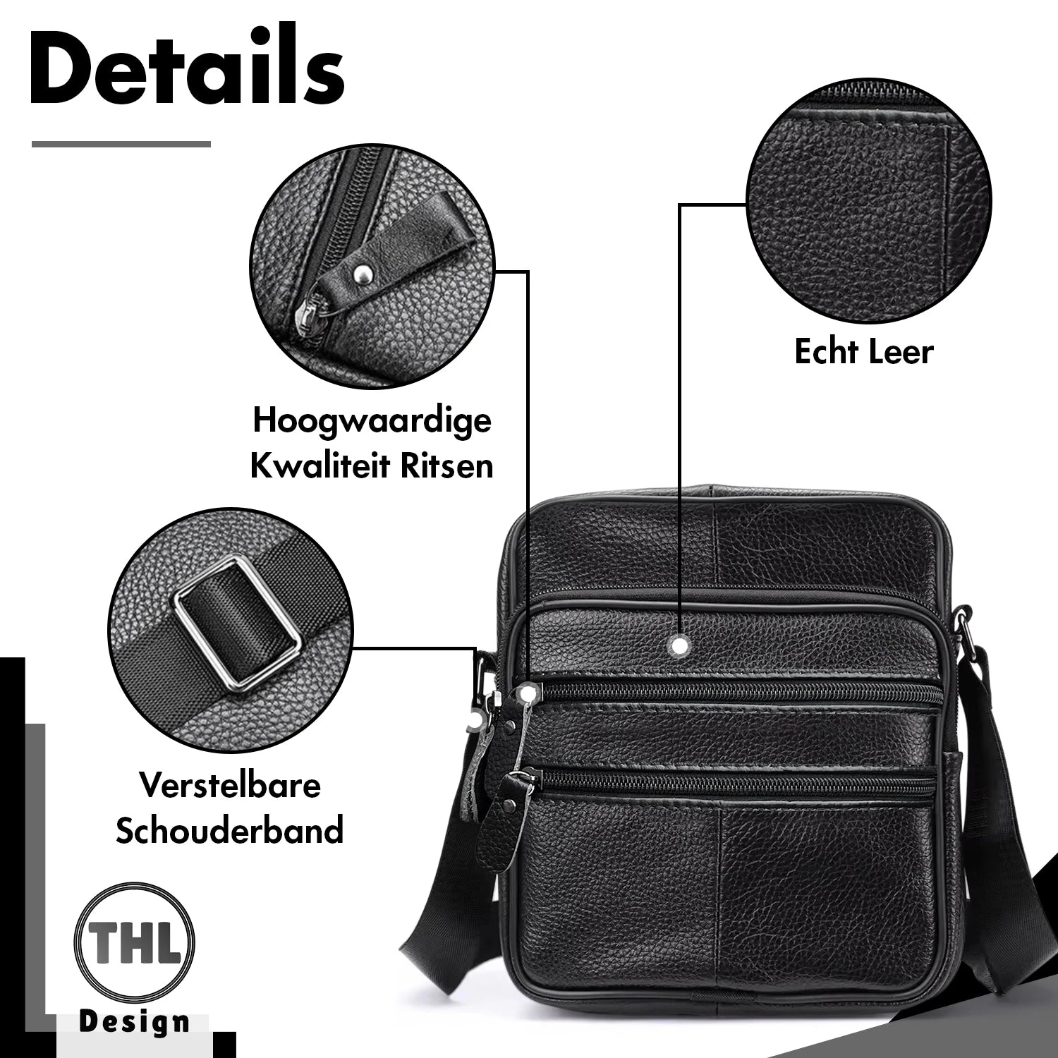 Echte leren schoudertas van het merk THL Design. De zwarte tas is gemaakt van een mooie kwaliteit rundleer wat zorgt voor een lange levensduur. De kleine leren schoudertas heeft een lang verstelbare schouderband die je op iedere gewenste lengte kan dragen en wat zorgt voor een prettig draagcomfort. Bij deze tas heb je allerlei handige ritsvakken waar je al je belangrijke spullen veilig en overzichtelijk kan opbergen.