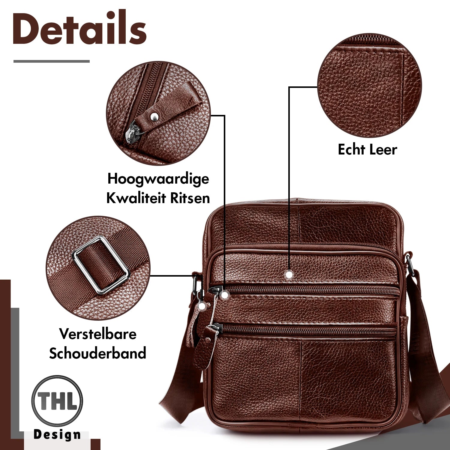 Echte leren schoudertas van het merk THL Design. De bruine tas is gemaakt van een mooie kwaliteit rundleer wat zorgt voor een lange levensduur. De kleine leren schoudertas heeft een lang verstelbare schouderband die je op iedere gewenste lengte kan dragen en wat zorgt voor een prettig draagcomfort. Bij deze tas heb je allerlei handige ritsvakken waar je al je belangrijke spullen veilig en overzichtelijk kan opbergen.