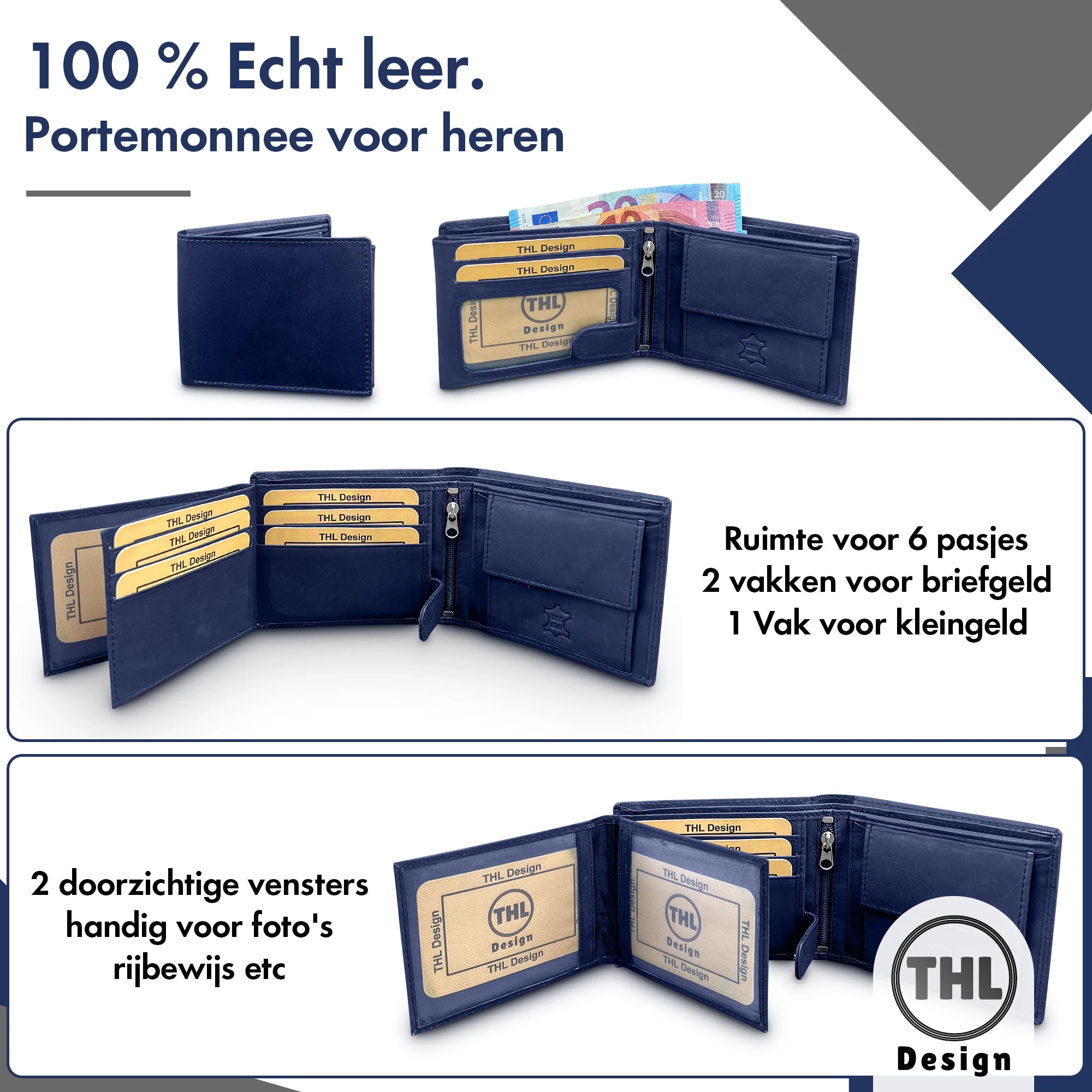 • Twee doorzichtige vensters – handig voor je rijbewijs, ID-kaart of een foto